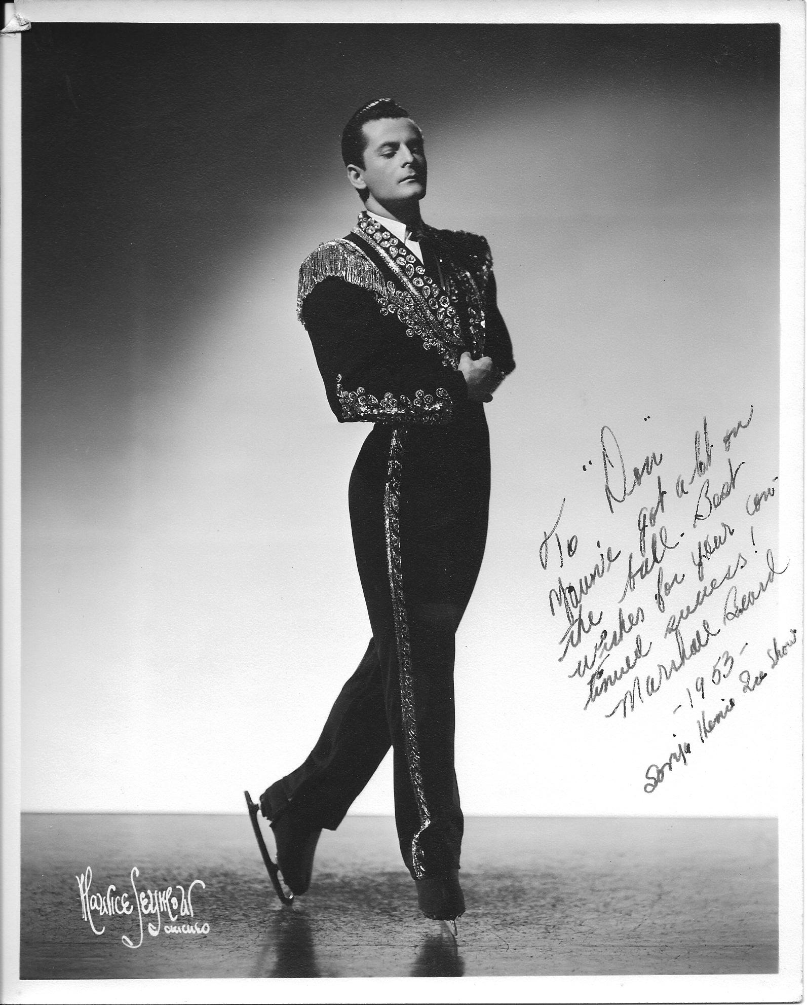 Marshall enjoyed a remarkable skating career that spanned several decades. I first met Marshall in the summer of 1952 during rehearsals for the Sonja Henie Ice Revue in San Bernardino, CA. Over the next five years with Sonja we toured the States, Canada, Europe, and South America. On our first European tour with Sonja, Marshall and I both purchased Rolleiflex cameras in Berlin and we both had movie cameras and were out often together on photo expeditions. This was a dream tour playing Paris, London, Berlin, Stockholm, and Oslo. Our two month engagement in London coincided with the coronation of Queen Elizabeth and a sold-out, one-month engagement in Sonja’s hometown Oslo. For Marshall these were heady times, partnering Sonja, the Queen of the Ice, on her 1st tour of Europe in 1953. Later Marshall had the distinction of partnering Sonja on the last tour of her career in South America with a closing engagement in Rio de Janiero in 1956. In addition to the Sonja Henie Ice Revue, Marshall also performed over the years in Ice Vogues, Holiday On Ice, Ice Follies, Ice Capades, as well as in pantomimes in Empress Hall, London. He also performed in hotel night club ice shows at the New Yorker hotel in NYC and the Adolphus hotel in Dallas that were popular in the 40s and 50s. Marshall wrapped up his professional skating career with Ice Capades, performing a family act with his wife, Margaret and her two children, Kathy and Jaime, for several years. As far as show skating was concerned you could say that Marshall “did it all” and mostly at a time when the popularity of ice shows was at its peak. Now almost all of these ice shows have disappeared and are a part of ice show history.