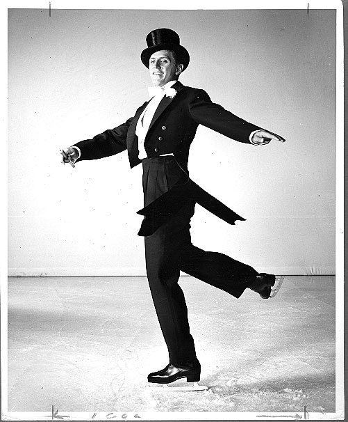 Another number featuring Belita blends both off and on ice with men in top hats and tails. She moves between the two groups of men where she begins with a long black skirt that is removed as the music turns to jazz. As she skates she is backed up by 12 men.